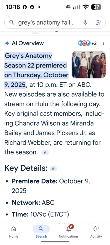 A few days before the fall TV season kicked off, I asked when long-running show “Grey’s Anatomy” would resume for the fall season. The AI confidently told me the season had “premiered” on October 9, 2025: three days in the future from when I asked the question. The date was right, but the tense was wrong. It’s a small mistake, but it’s one that instantly shows an inherent flaw in AI answers and writing. If I had copied that into a blog post, readers would either think we were mindlessly using AI without verification or that we didn’t know how calendars work.