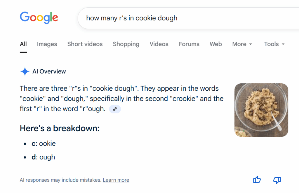 Another user asked Google how many “R’s” are in cookie dough. Google’s AI cheerfully informed them that there were three, and even explained where they supposedly appeared: in the word “crookie” and the “r” in “r”ough.” There are of course no R’s in the words “cookie dough.” But here the answer is, presented with total confidence with bullet points and a strange explanation.